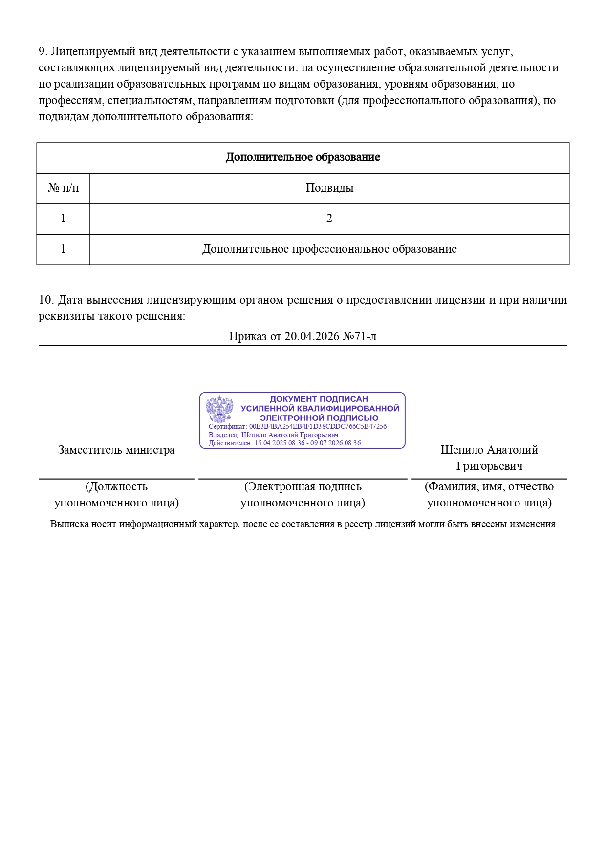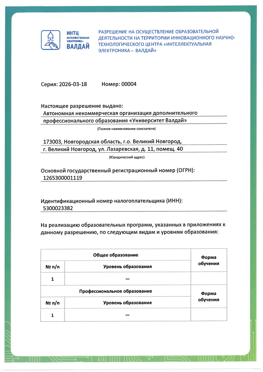 Разрешение на осуществление образовательной деятельности на территории Инновационного научно-технологического центра «Интеллектуальная электроника — Валдай» № 00004 от 18.03.2026