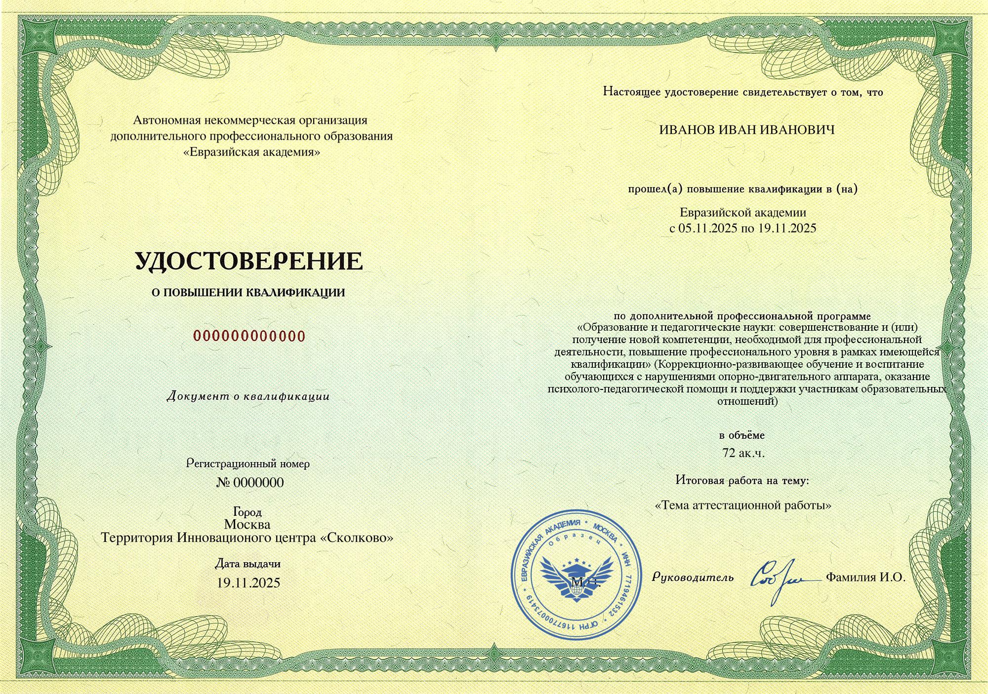 Выдаваемые документы полностью соответствуют новым (с 01.09.2025) требованиям закона и подходят для трудоустройства педагогом на всех уровнях образования и для всех видов образования (в соответствии с образовательной программой). Евразийская академия и Университет Валдай осуществляют образовательную деятельность на основании специальных разрешений Сколково и ИНТЦ Валдай соответственно (смотреть), что требуется с 01.09.2025 согласно ч. 5.2. ст. 47 ФЗ «Об образовании в Российской Федерации» для того, чтобы выдаваемые документы принимались для трудоустройства педагогов по общеобразовательным программам.