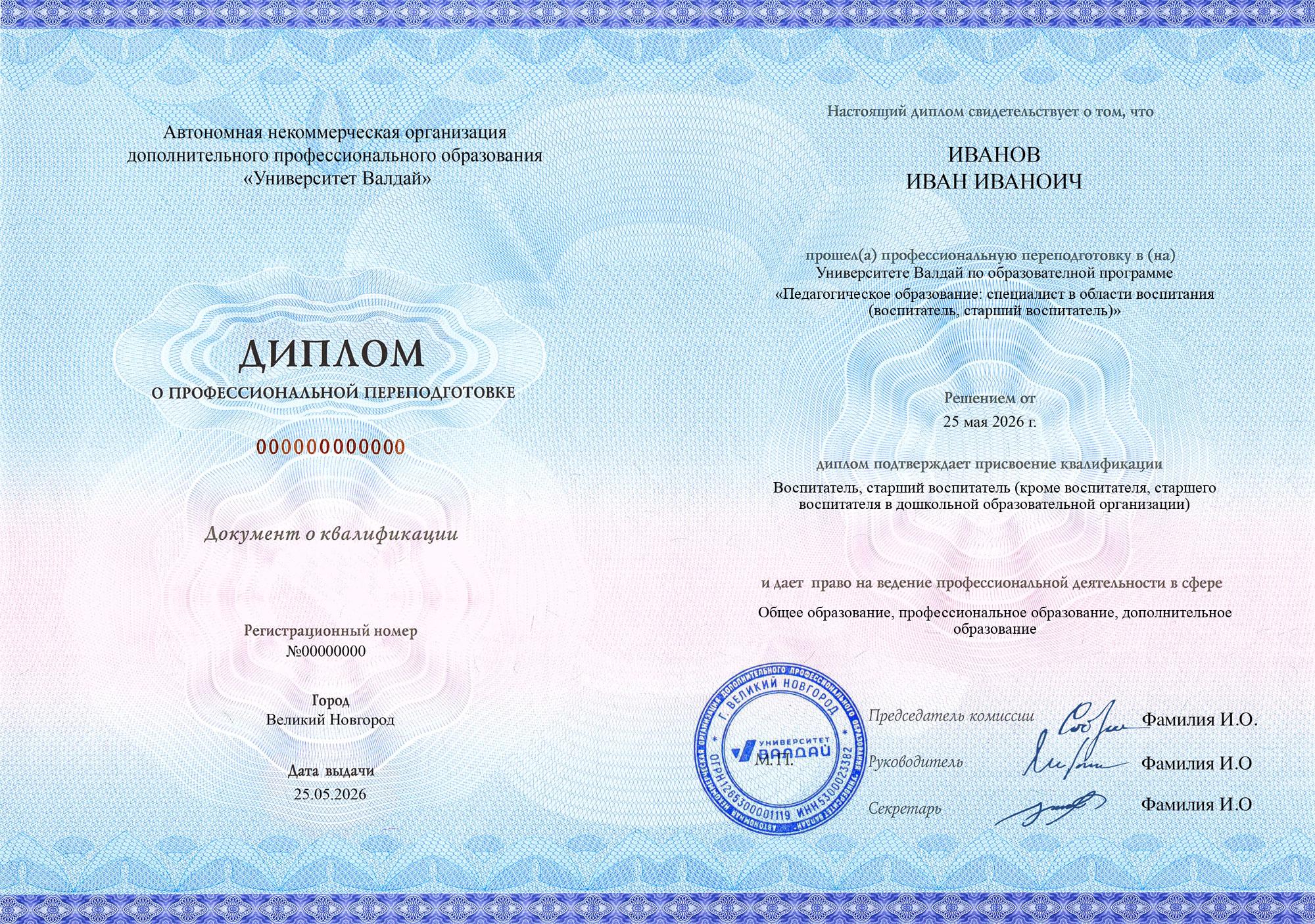 Выдаваемые документы полностью соответствуют новым (с 01.09.2025) требованиям закона и подходят для трудоустройства педагогом на всех уровнях образования и для всех видов образования (в соответствии с образовательной программой). Евразийская академия и Университет Валдай осуществляют образовательную деятельность на основании специальных разрешений Сколково и ИНТЦ Валдай соответственно (смотреть), что требуется с 01.09.2025 согласно ч. 5.2. ст. 47 ФЗ «Об образовании в Российской Федерации» для того, чтобы выдаваемые документы принимались для трудоустройства педагогов по общеобразовательным программам.