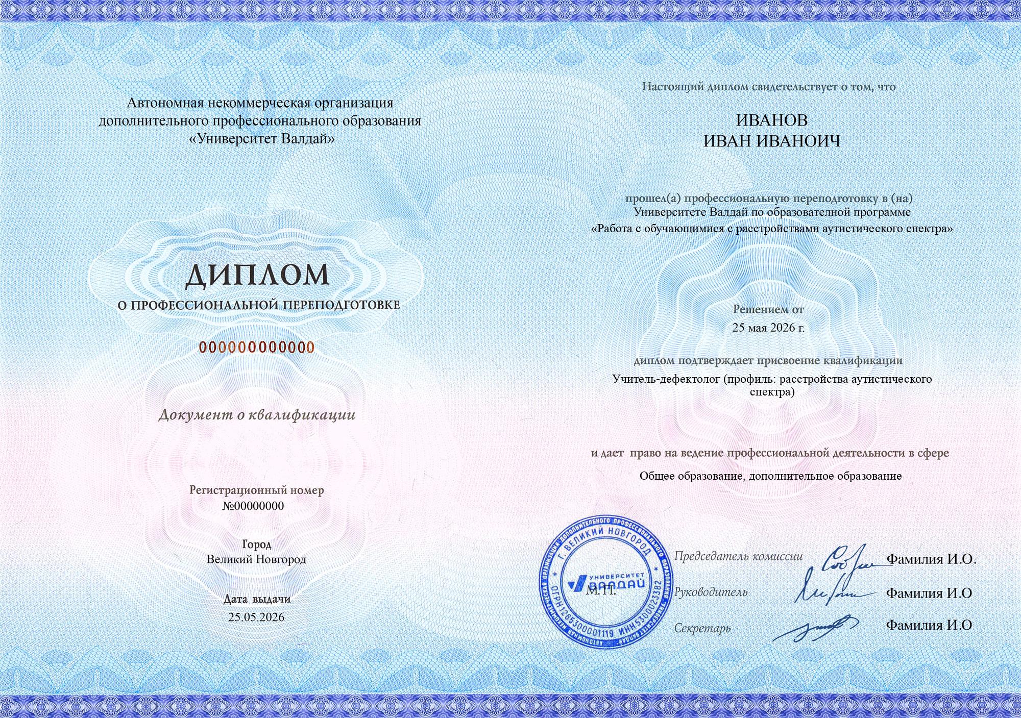 Выдаваемые документы полностью соответствуют новым (с 01.09.2025) требованиям закона и подходят для трудоустройства педагогом на всех уровнях образования и для всех видов образования (в соответствии с образовательной программой). Евразийская академия и Университет Валдай осуществляют образовательную деятельность на основании специальных разрешений Сколково и ИНТЦ Валдай соответственно (смотреть), что требуется с 01.09.2025 согласно ч. 5.2. ст. 47 ФЗ «Об образовании в Российской Федерации» для того, чтобы выдаваемые документы принимались для трудоустройства педагогов по общеобразовательным программам.