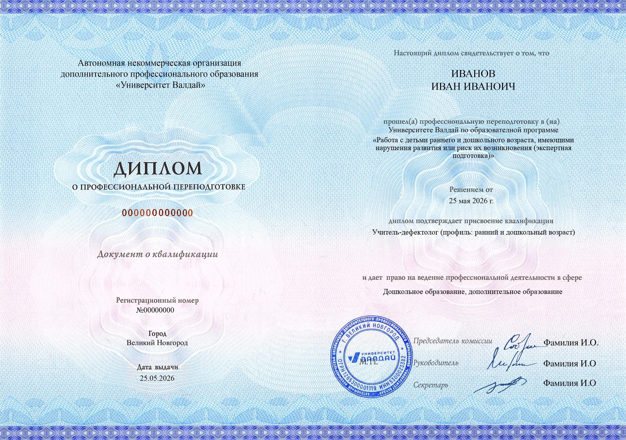Выдаваемые документы полностью соответствуют новым (с 01.09.2025) требованиям закона и подходят для трудоустройства педагогом на всех уровнях образования и для всех видов образования (в соответствии с образовательной программой). Евразийская академия и Университет Валдай осуществляют образовательную деятельность на основании специальных разрешений Сколково и ИНТЦ Валдай соответственно (смотреть), что требуется с 01.09.2025 согласно ч. 5.2. ст. 47 ФЗ «Об образовании в Российской Федерации» для того, чтобы выдаваемые документы принимались для трудоустройства педагогов по общеобразовательным программам.