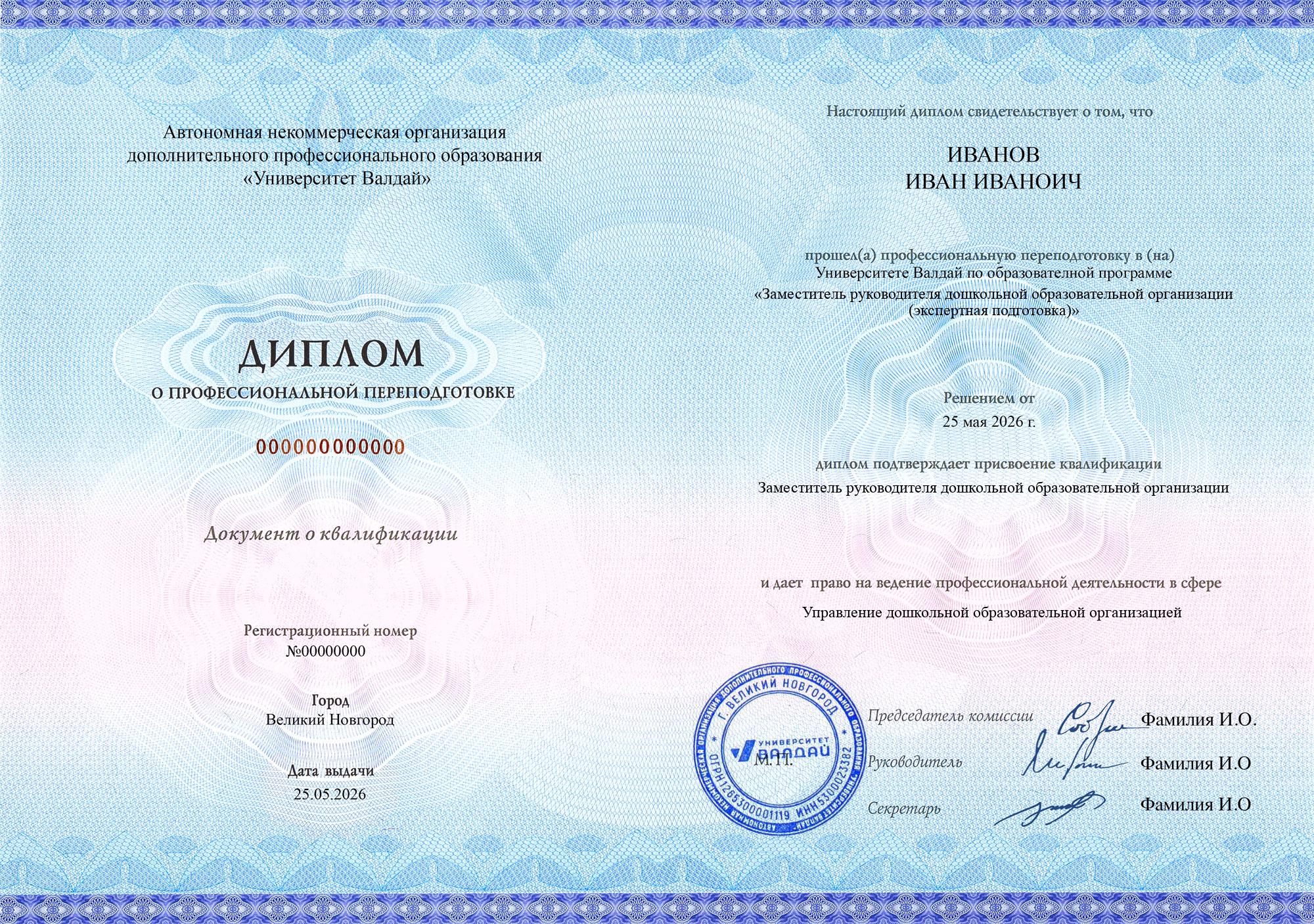 Выдаваемые документы полностью соответствуют новым (с 01.09.2025) требованиям закона и подходят для трудоустройства педагогом на всех уровнях образования и для всех видов образования (в соответствии с образовательной программой). Евразийская академия и Университет Валдай осуществляют образовательную деятельность на основании специальных разрешений Сколково и ИНТЦ Валдай соответственно (смотреть), что требуется с 01.09.2025 согласно ч. 5.2. ст. 47 ФЗ «Об образовании в Российской Федерации» для того, чтобы выдаваемые документы принимались для трудоустройства педагогов по общеобразовательным программам.