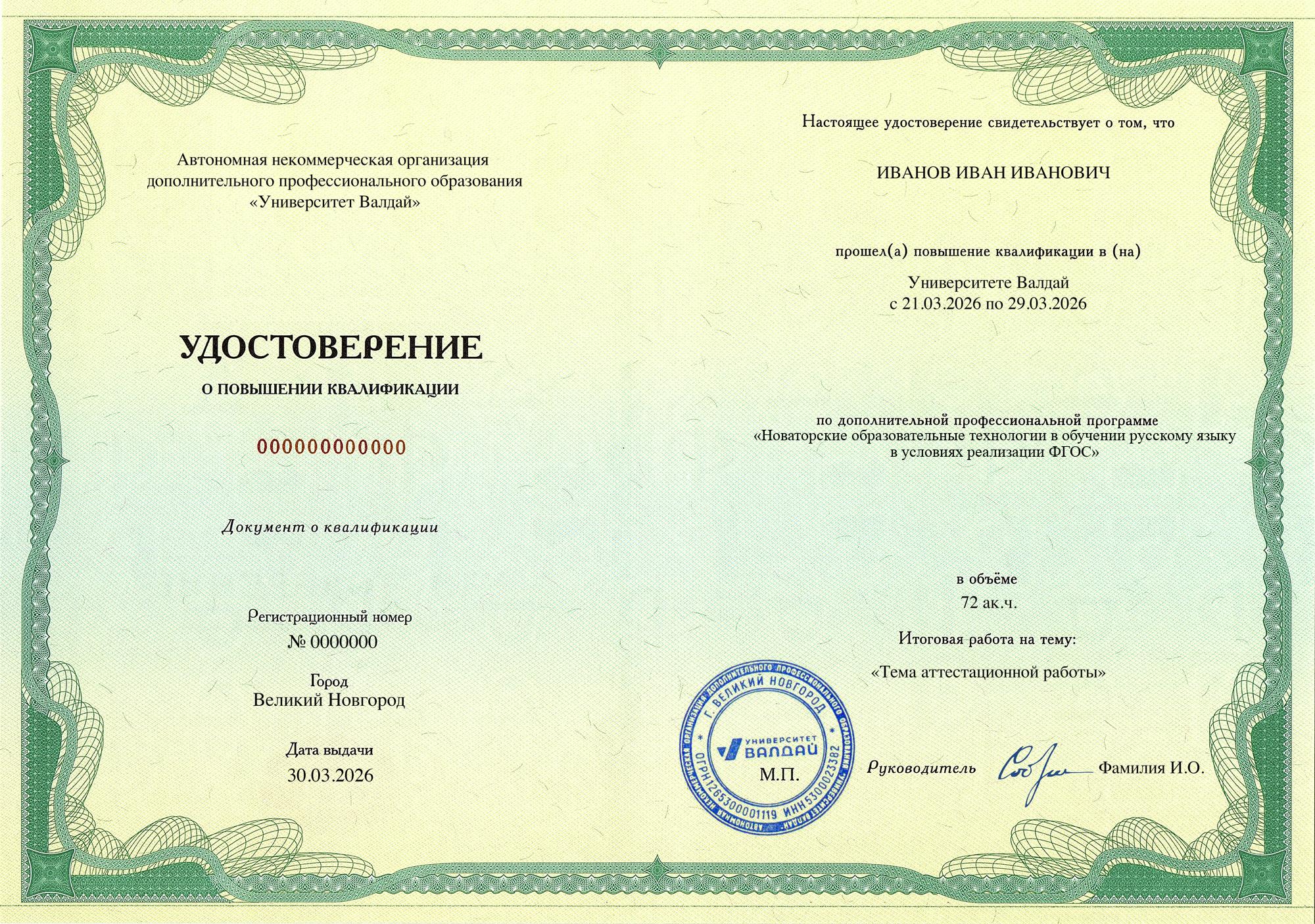 Выдаваемые документы полностью соответствуют новым (с 01.09.2025) требованиям закона и подходят для трудоустройства педагогом на всех уровнях образования и для всех видов образования (в соответствии с образовательной программой). Евразийская академия и Университет Валдай осуществляют образовательную деятельность на основании специальных разрешений Сколково и ИНТЦ Валдай соответственно (смотреть), что требуется с 01.09.2025 согласно ч. 5.2. ст. 47 ФЗ «Об образовании в Российской Федерации» для того, чтобы выдаваемые документы принимались для трудоустройства педагогов по общеобразовательным программам.