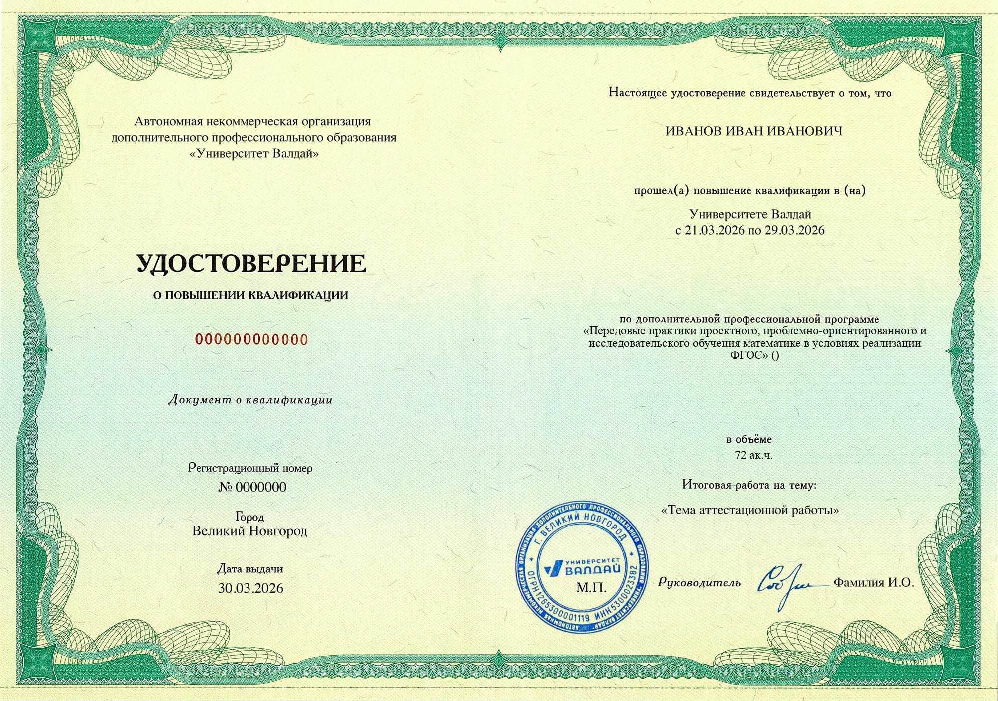 Выдаваемые документы полностью соответствуют новым (с 01.09.2025) требованиям закона и подходят для трудоустройства педагогом на всех уровнях образования и для всех видов образования (в соответствии с образовательной программой). Евразийская академия и Университет Валдай осуществляют образовательную деятельность на основании лицнезий на образовательную деятельности и специальных разрешений Сколково и ИНТЦ Валдай соответственно (смотреть), что требуется с 01.09.2025 согласно ч. 5.2. ст. 47 ФЗ «Об образовании в Российской Федерации» для того, чтобы выдаваемые документы принимались для трудоустройства педагогов по общеобразовательным программам.