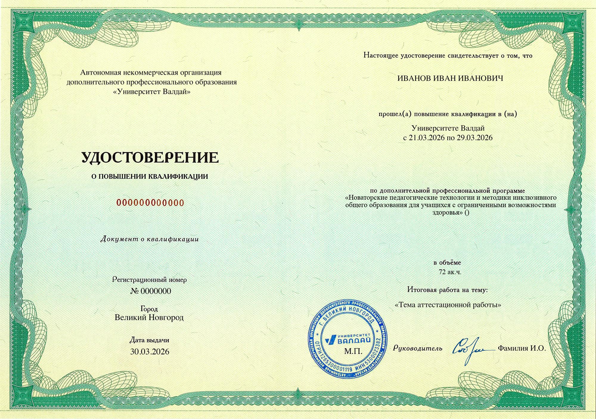 Выдаваемые документы полностью соответствуют новым (с 01.09.2025) требованиям закона и подходят для трудоустройства педагогом на всех уровнях образования и для всех видов образования (в соответствии с образовательной программой). Евразийская академия и Университет Валдай осуществляют образовательную деятельность на основании лицнезий на образовательную деятельности и специальных разрешений Сколково и ИНТЦ Валдай соответственно (смотреть), что требуется с 01.09.2025 согласно ч. 5.2. ст. 47 ФЗ «Об образовании в Российской Федерации» для того, чтобы выдаваемые документы принимались для трудоустройства педагогов по общеобразовательным программам.