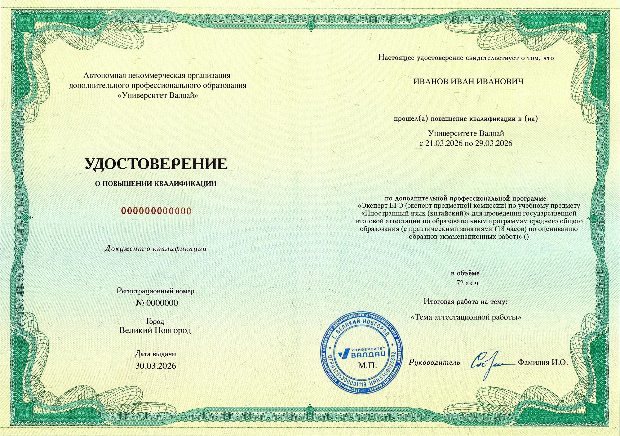 Эксперт ЕГЭ (эксперт предметной комиссии) по учебному предмету «Иностранный язык (китайский)» для проведения государственной итоговой аттестации по образовательным программам среднего общего образования (с практическими занятиями (18 часов) по оцениванию образцов экзаменационных работ)